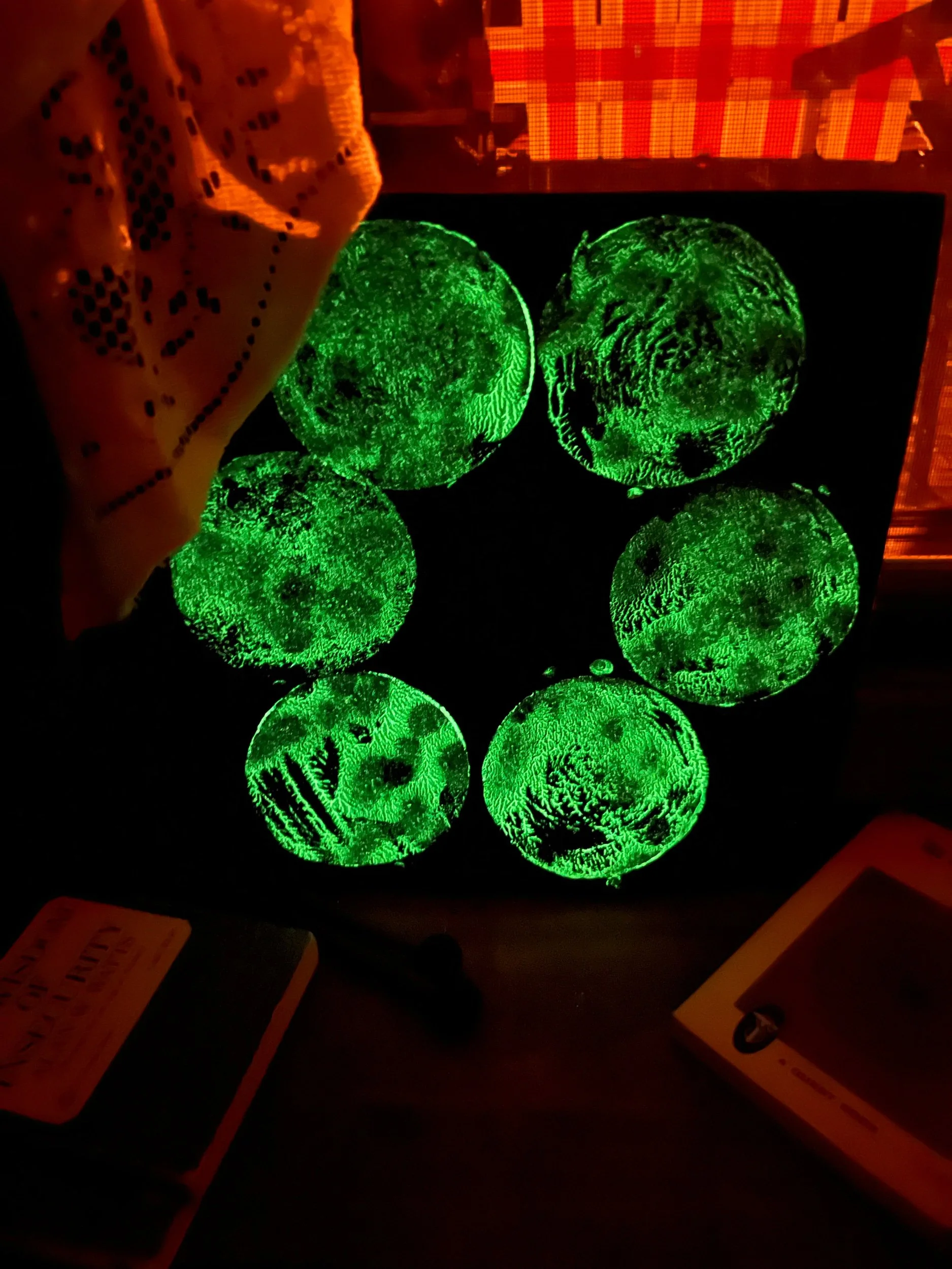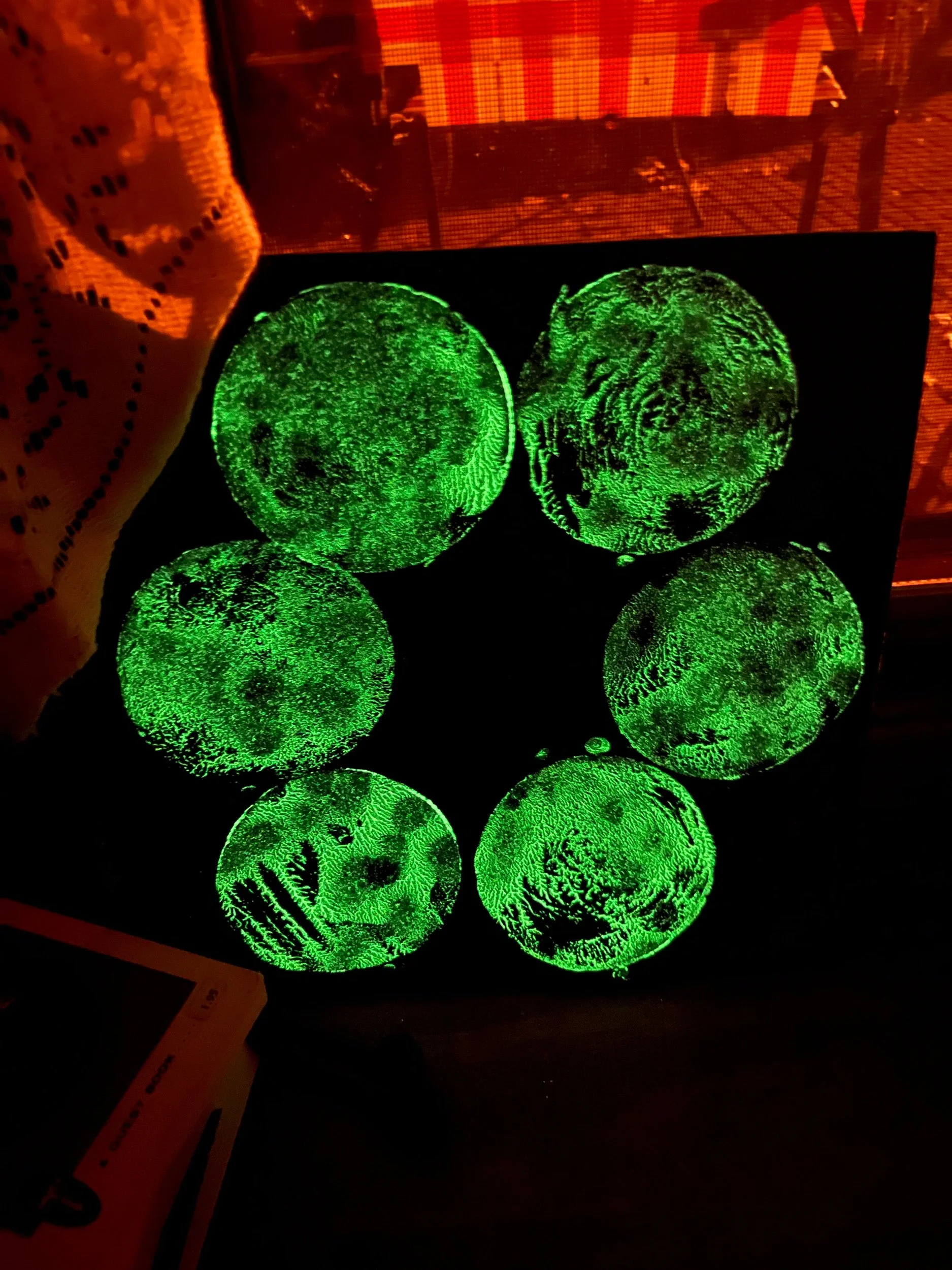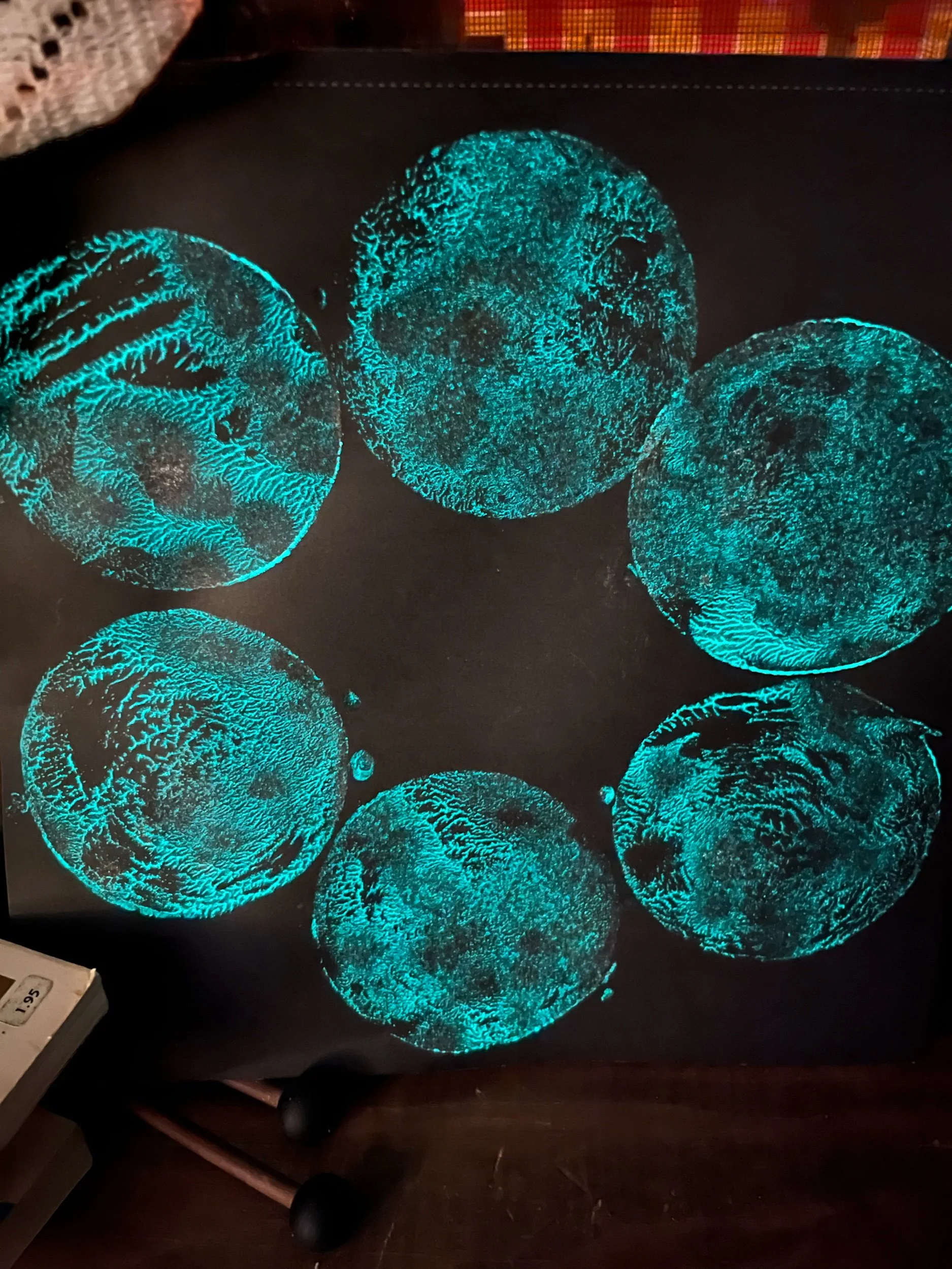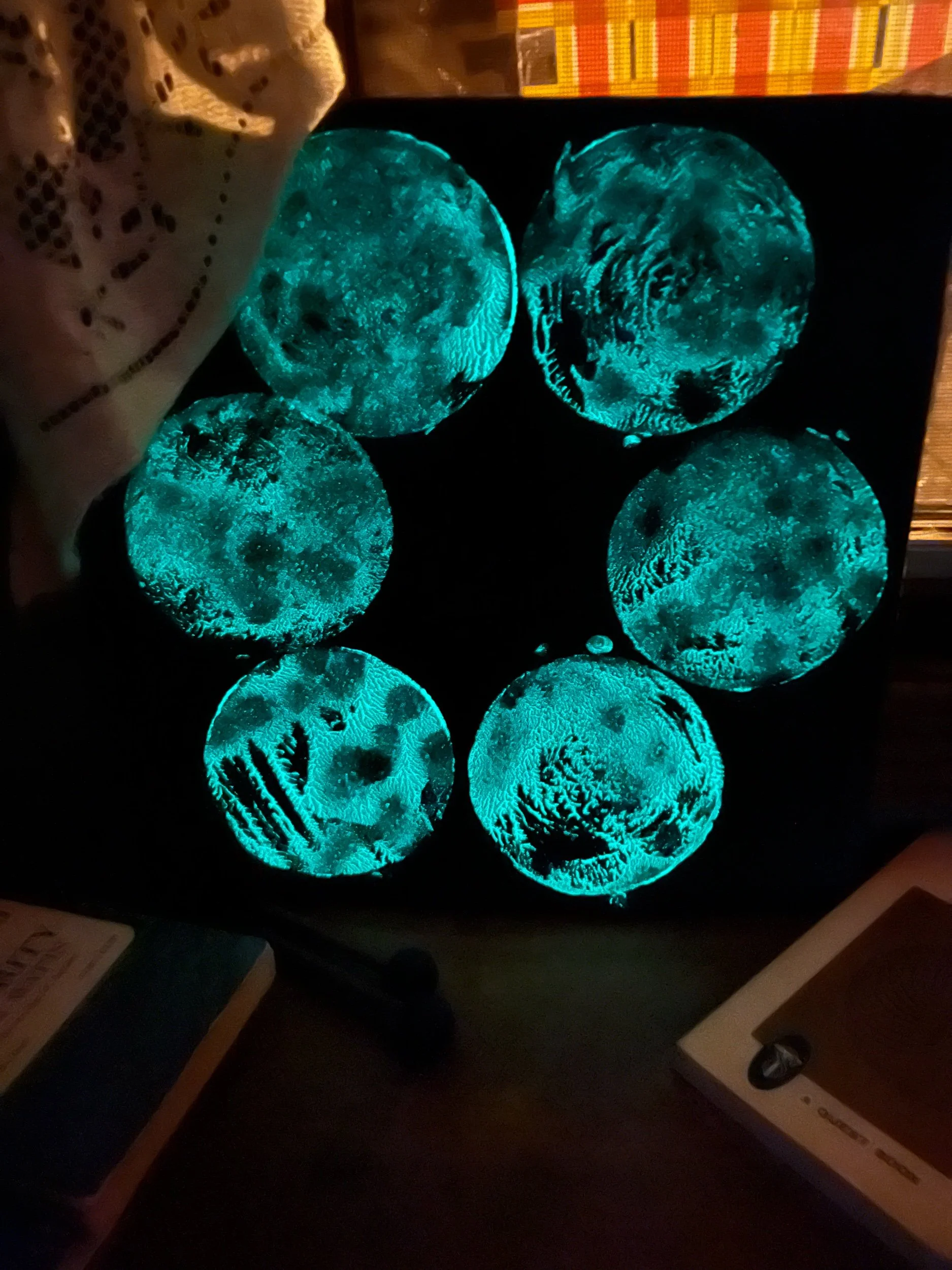 Shop › 6 Aspects of the Full Moon - Glow in the Dark Print Image 1 of 5 Image 2 of 5 Image 3 of 5 Image 4 of 5 Image 5 of 5 6 Aspects of the Full Moon - Glow in the Dark Print from $28.00 Glow in the Dark acrylic on black cardstock 12”x12”2026 Framed: Select Framed Framed Unframed Add To Cart Added! Glow in the Dark acrylic on black cardstock 12”x12”2026