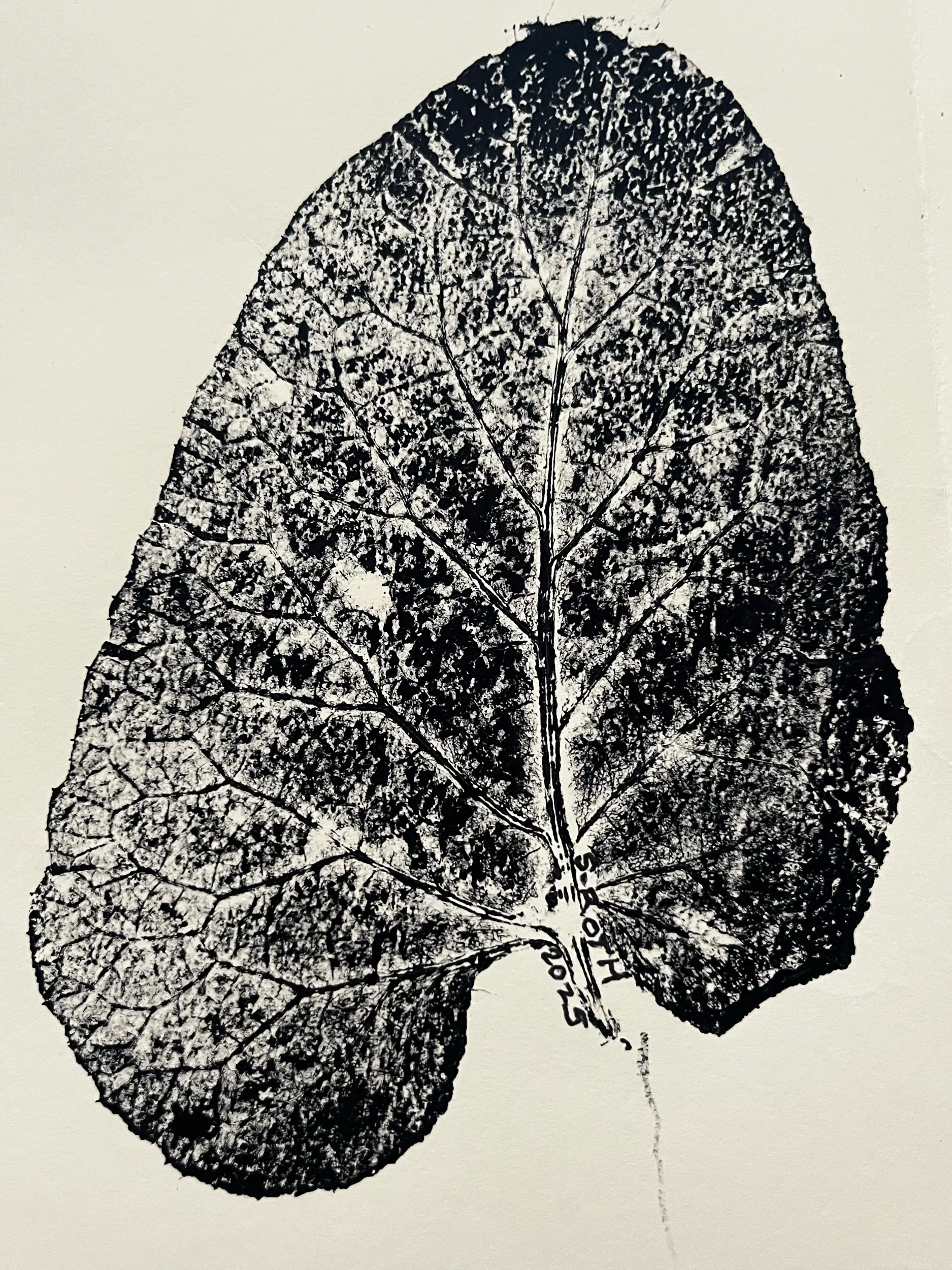 Handmade botanical monoprint, double mirror image, made with a single Arctium Lappa Leaf (Burdock), printed with black silkscreen ink on ivory cardstock.