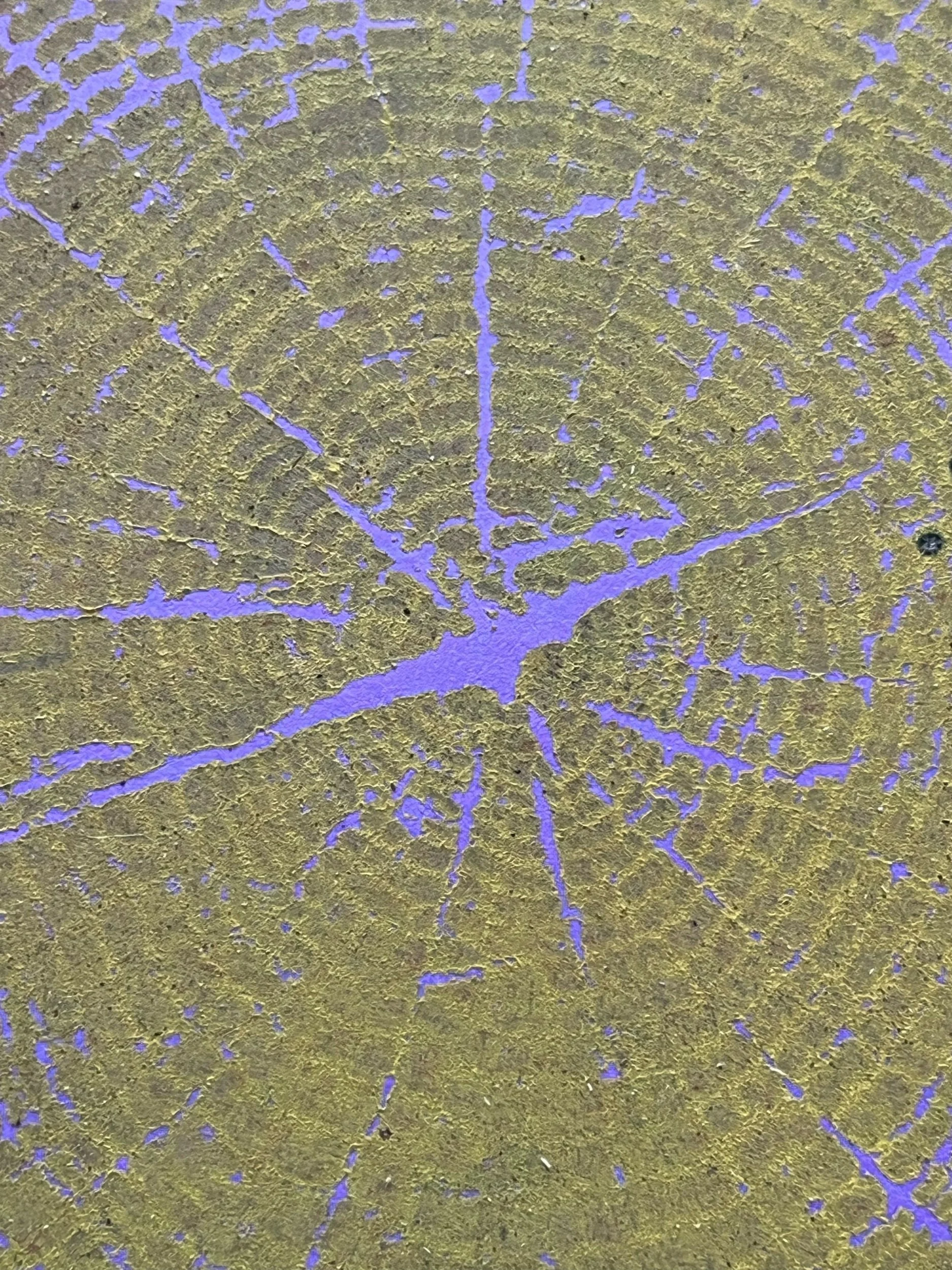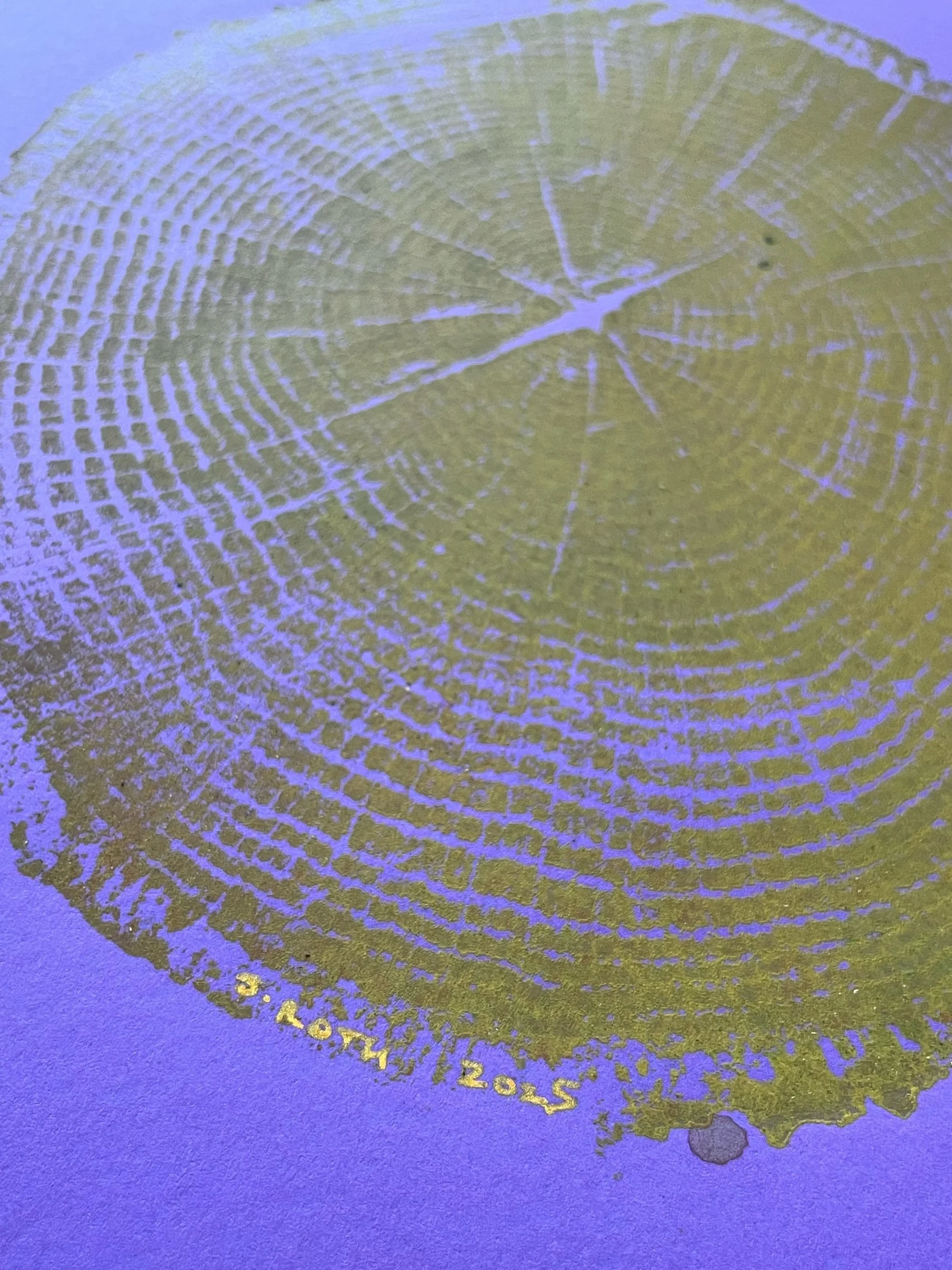 Handmade Quercus Rubra tree ring print made with ethically sourced, already fallen red oak tree. Printed in yellow silkscreen ink on purple cardstock.