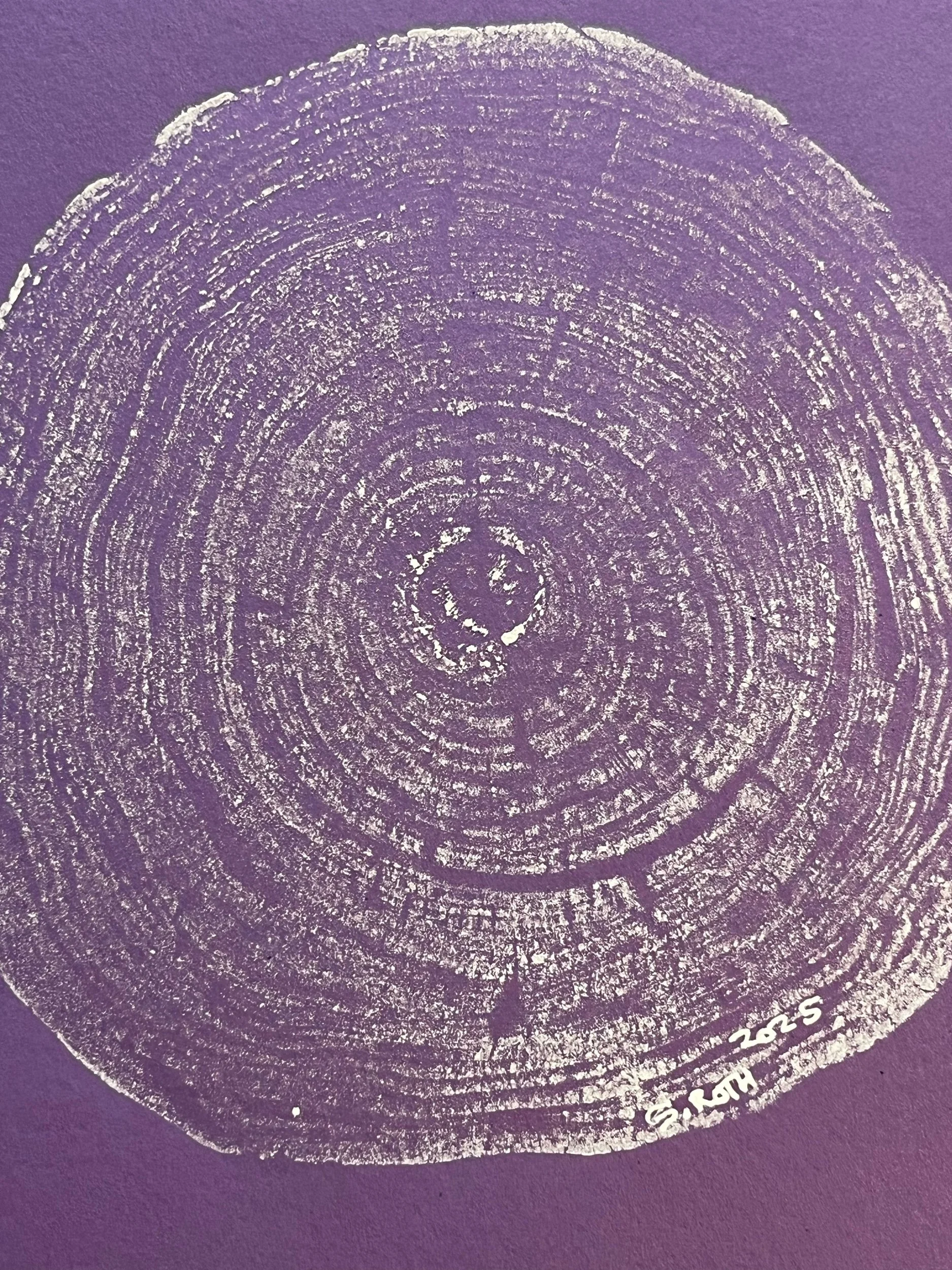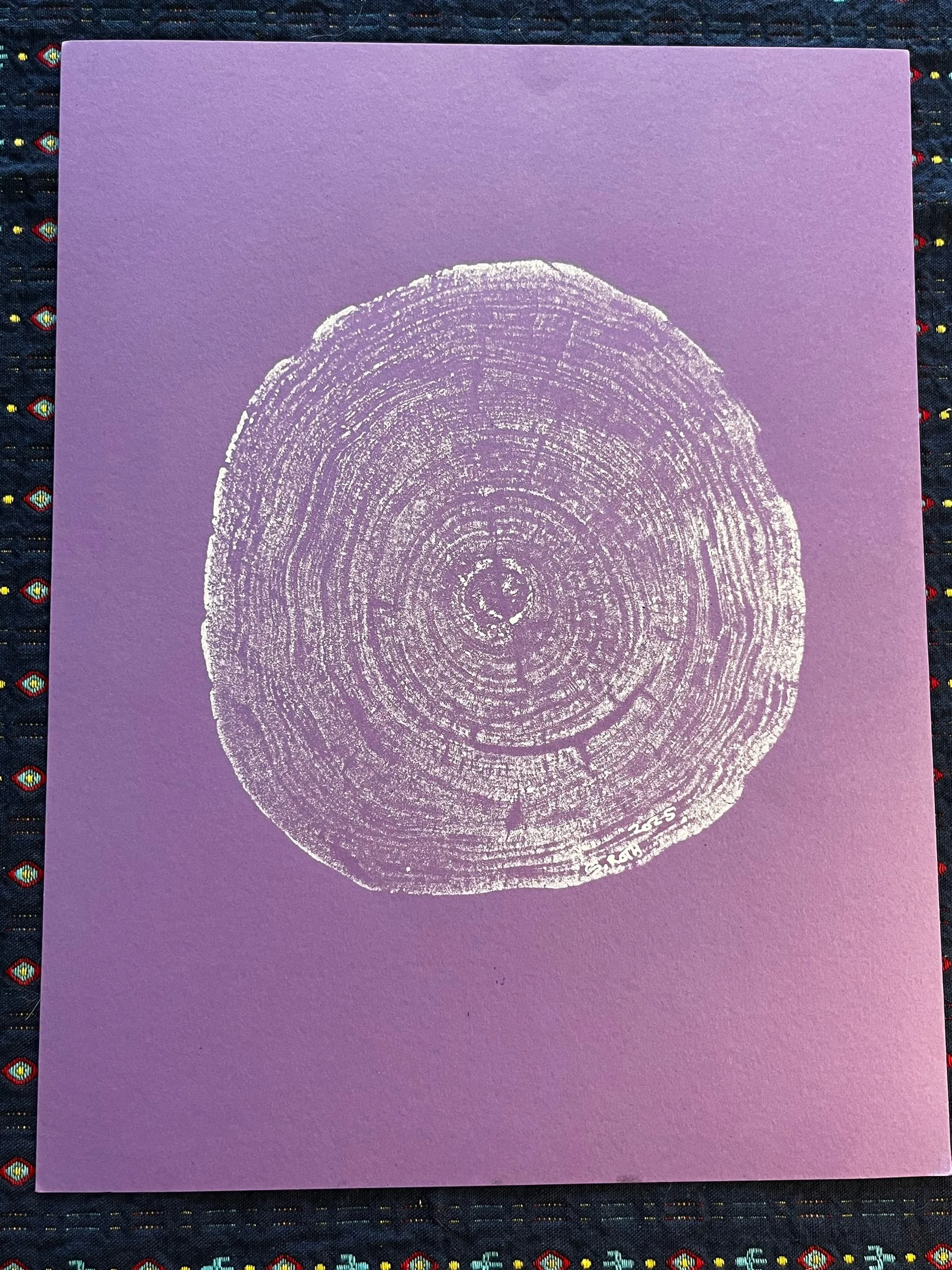 Handmade Betula Papyrifera tree ring print Made with ethically sourced, already fallen birch tree. White silkscreen ink on purple cardstock.