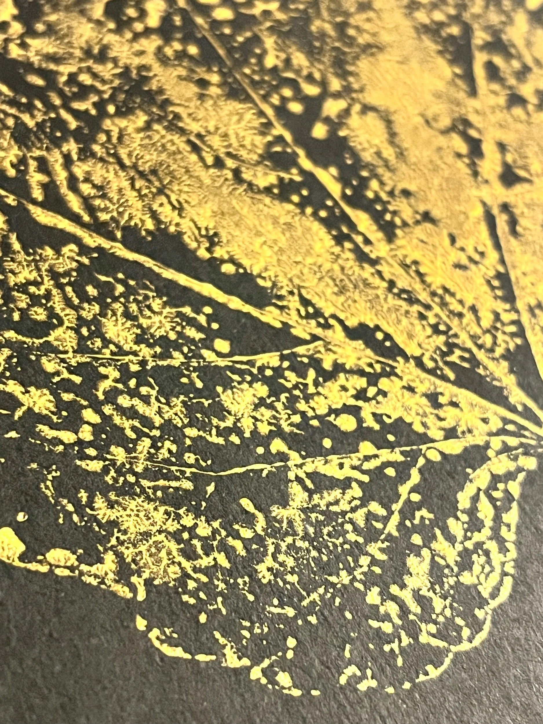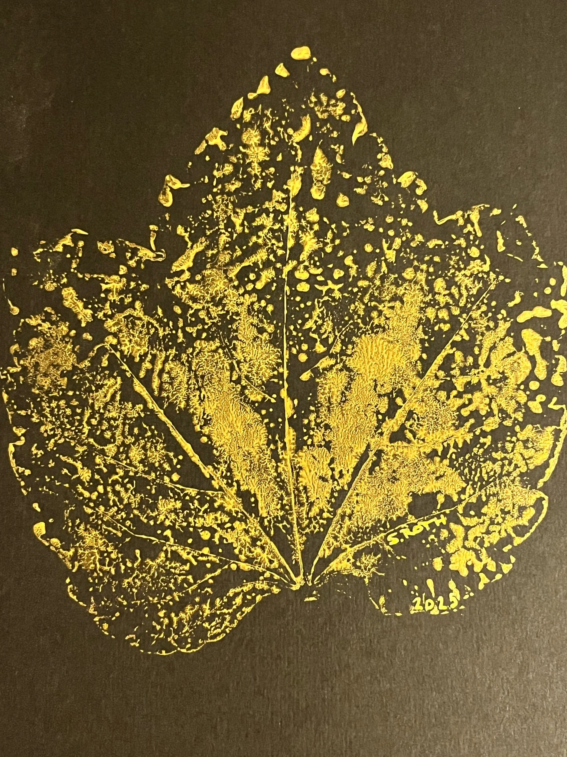 Handmade botanical monoprint made with a giant Parthenocissus Triscupidata leaf (Boston Ivy), printed with gold silkscreen ink on black cardstock.