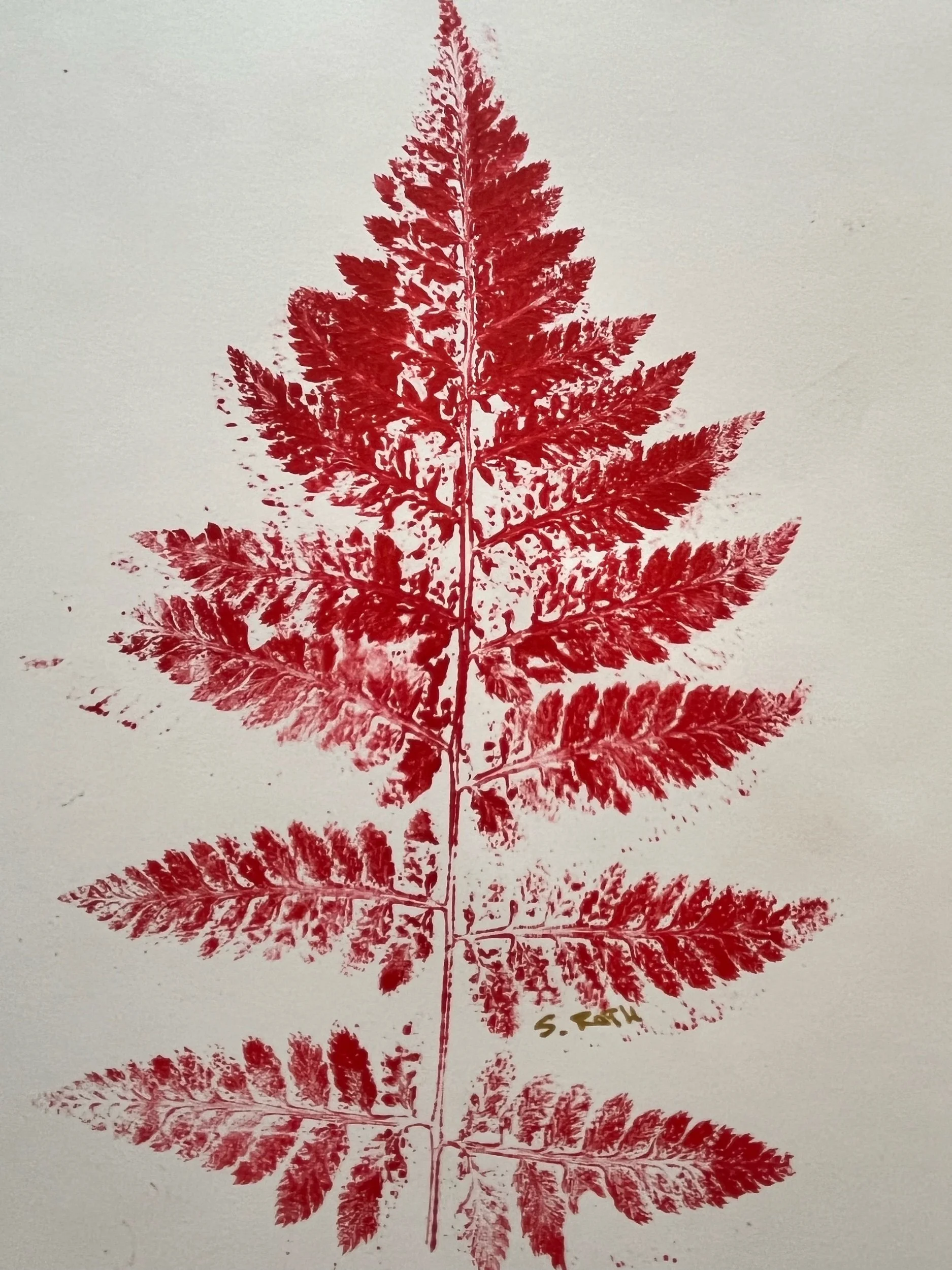 Handmade monoprint made with an ostrich fern (Matteuccia Struthiopteris), printed with red etching ink on ivory cardstock.