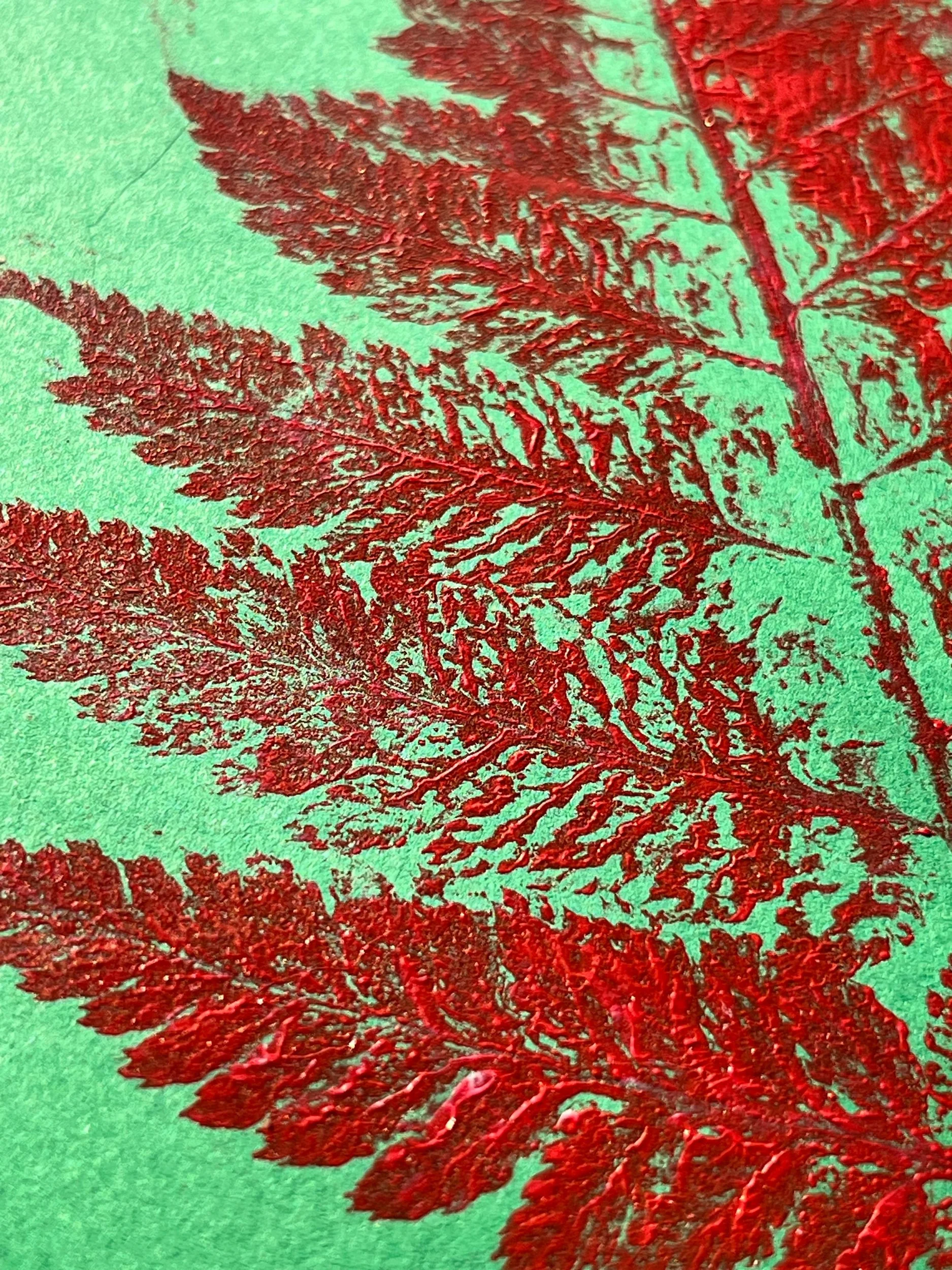 Handmade monoprint made with an ostrich fern (Matteuccia Struthiopteris), printed with red etching ink on green cardstock.